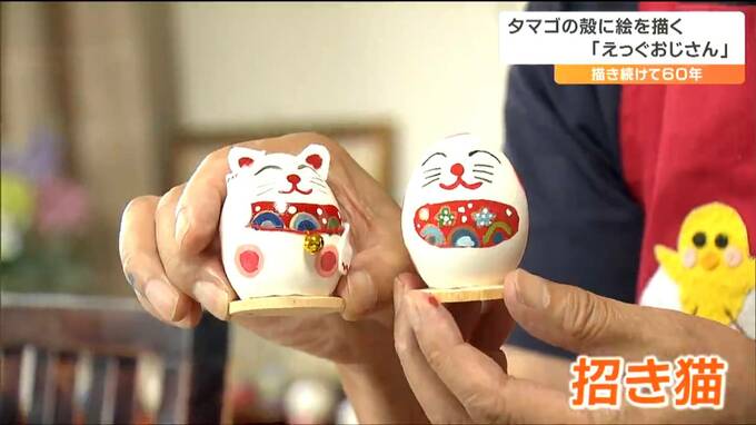 「完成形がこれ。招き猫でございます。この球面に絵を描く。何とも言えない、平面でないところに書く心地よさがある。捨てられるタマゴの殻のようなゴミでも創意工夫することで蘇る。宝物になる」