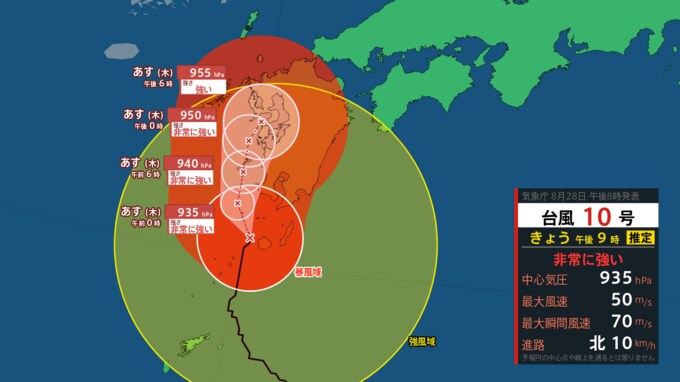 台風10号・少々北上する 現在「屋久島の西約30km」中心気圧935hPa「非常に強い勢力」は変わらず… いまどこ?今後どこへ?気象予報士の解説あり【台風情報・最新進路予想図(28日午後9時更新)】 青森テレビ 2024年8月28日(水) 21:05 国内