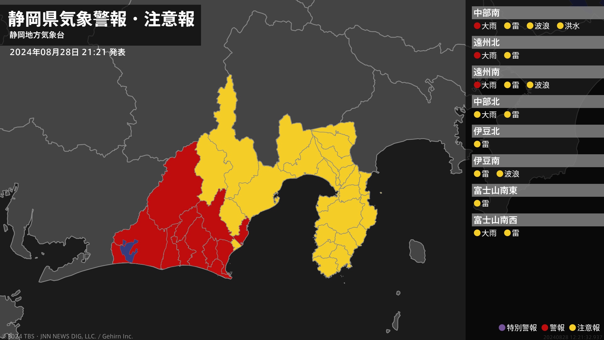 気象台は、午後9時21分に、大雨警報(土砂災害、浸水害)を焼津市に発表しました。