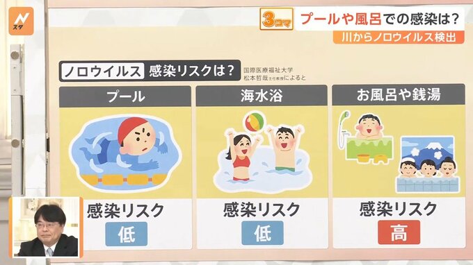 通常、プールは塩素消毒がされているので、感染例はほとんどないと思います。ただ、海外ではプールで感染する事例がありましたが、そのときは管理ができてなかったということです。