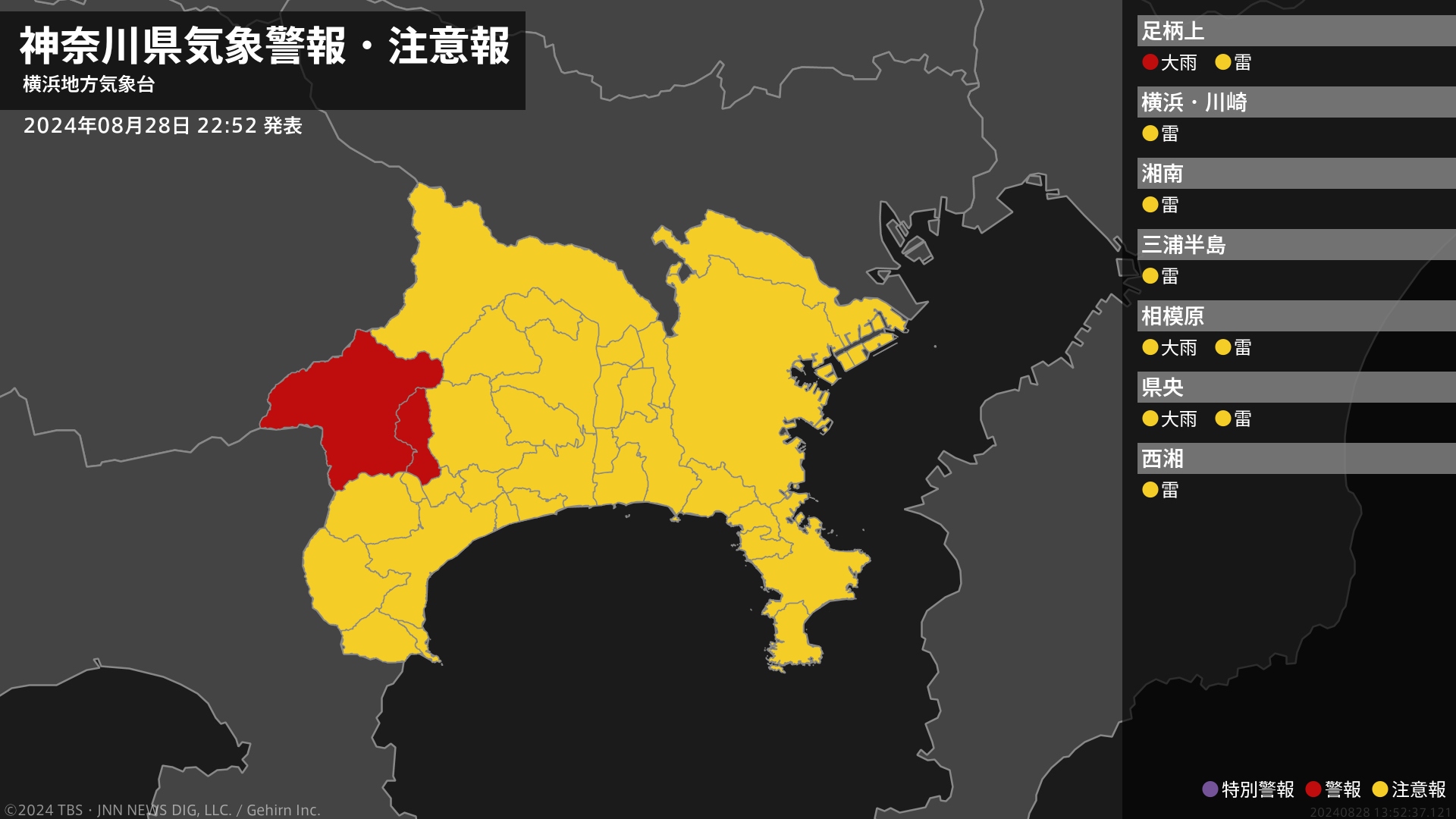 気象台は、午後10時52分に、大雨警報(土砂災害)を松田町、山北町に発表しました。