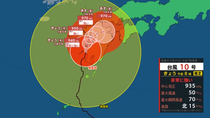 強い台風第10号は、きょうは九州北部地方を北上し、その後、進路を東よりに変えて、明後日にかけて西日本を東へ進む見込みです。暴風、土砂災害や低い土地の浸水、河川の増水や氾濫、高潮に厳重に警戒し、高波に警戒してください。また、西日本と東日本では、あすにかけて線状降水帯が発生して大雨災害発生の危険度が急激に高まる可能性があります。