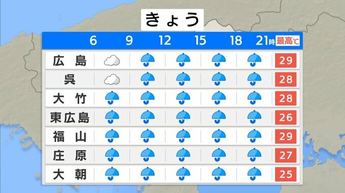 きょう29日(木)朝の広島県内は、雨が降っています。県の西側では台風10号の強風域に入り、風もやや強くなっています。三原市本郷では午前6時すぎに、瞬間的に16.5m/sの風が吹きました。最低気温は、広島市中区で25.7℃、庄原市で22.8℃でした。