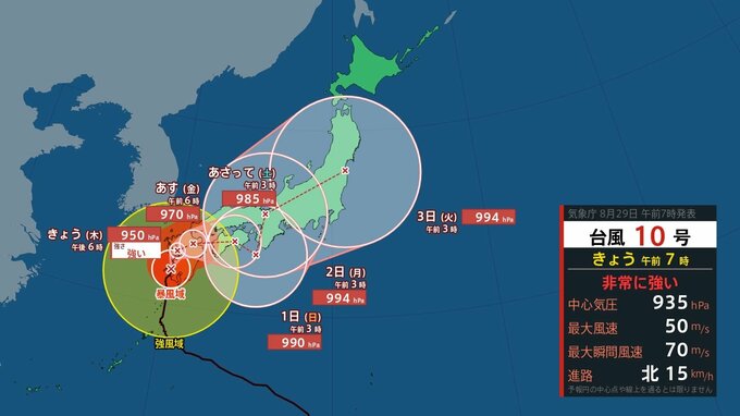 台風10号が次第に近付いています。現在、非常に強い勢力で鹿児島県の西海上を時速15kmの速さで北上しています。広島県への最接近はあす30日夜遅くからあさって31日午前中にかけてになりそうです。きょうから雨が降り続き、総雨量がかなり多くなる見込みです。またあすは、暴風や高波の可能性があります。ハザードマップやキキクルの使い方の確認、飛ばされやすい物をしまっておくなど、今のうちにできる対策をしておいてください。