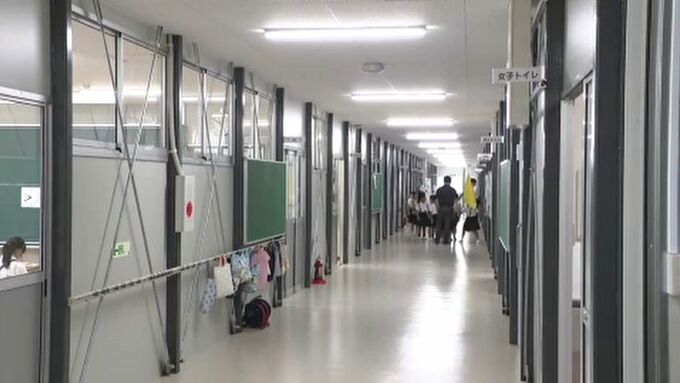 8月19日、グラウンドに2階建てのプレハブ型の仮設校舎が完成し、29日、児童が真新しい校内を見学しました。