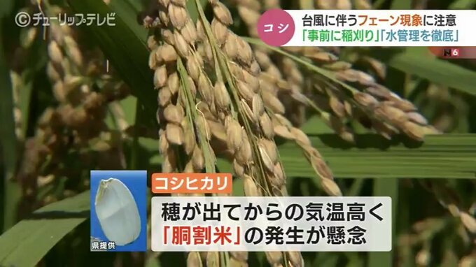 「コシヒカリ」と「富富富」について、県は収穫予定日ごろに台風によるフェーン現象が予想される場合は、事前に刈り取るよう呼びかけています。
