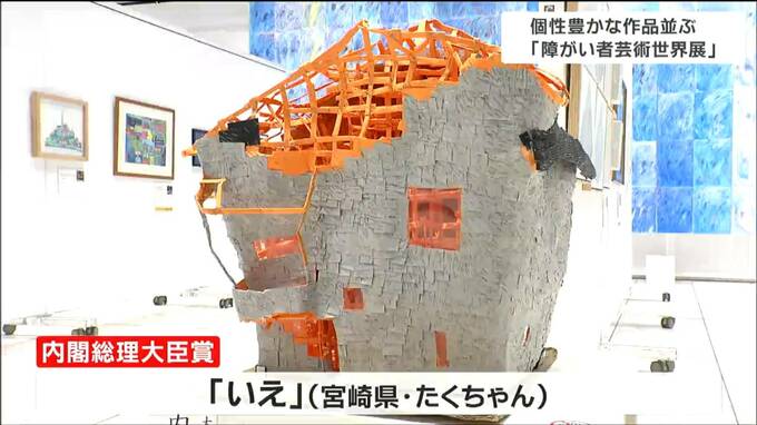 大賞の内閣総理大臣賞を受賞したのは、宮崎県の「たくちゃん」さんが制作した「いえ」という作品。小さく切った色紙やダンボールをホチキスで繋ぎ合わせ完成させました。