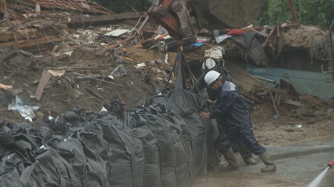 「正午過ぎです。強い雨が降り続く中、現在も復旧作業が続けられています。これ以上、土が流れ込まないよう、現場には土のうが置かれています」