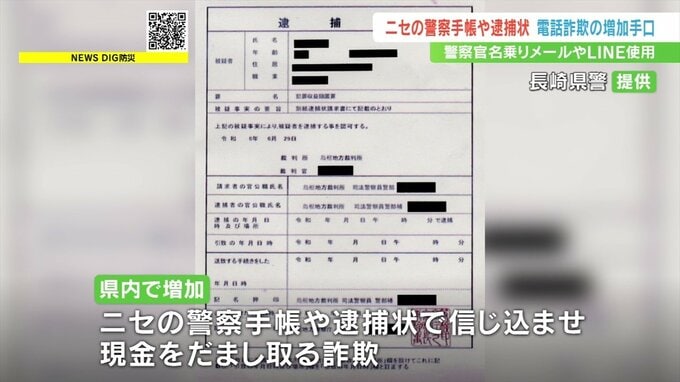 ニセの警察手帳や逮捕状で相手を信じ込ませて現金を騙し取る詐欺が県内で増加しています。