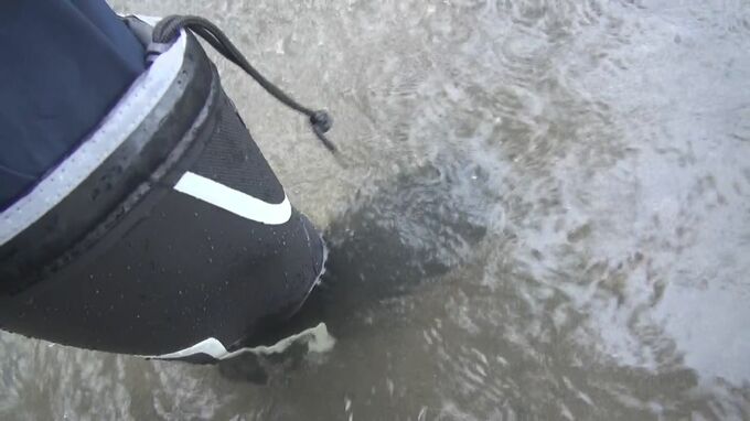 「三重県津市の住宅街では道路が川のように冠水しています。私の足首くらいの深さまで水が来ています」