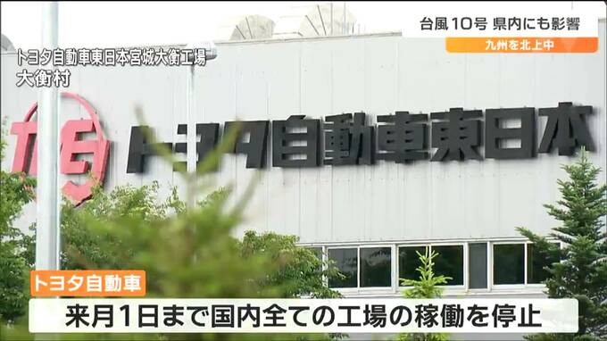 台風の影響は県内にも出始めています。トヨタ自動車は従業員の安全を考慮し、来月1日まで国内全ての工場の稼働を停止することを決めました。大衡村にある子会社「トヨタ自動車東日本宮城大衡工場」でも工場の稼働が停止します。9月2日からの対応については30日午後に判断するということです。