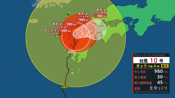 台風10号・少々右へ… 現在は長崎県「島原市付近」“ノロノロ”と迷走中…中心気圧985hPaに いまどこ?今後どこへ?【台風情報・最新進路予想図(29日午後7時更新)】 青森テレビ 2024年8月29日(木) 19:15 国内