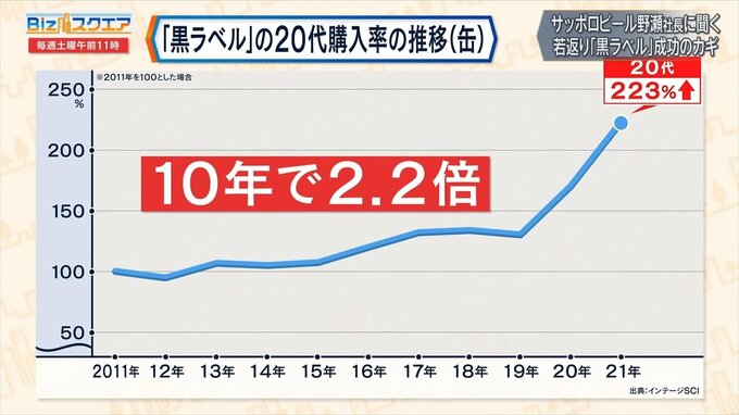 ーー若者のビール離れと言われる中、20代の若者がスーパーや通販などで黒ラベルを選ぶ割合がこの10年で2.2倍に増えている。