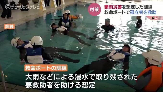 このうち救命ボートを使った訓練では、大雨などによる浸水で取り残された要救助者を助ける想定で行われました。