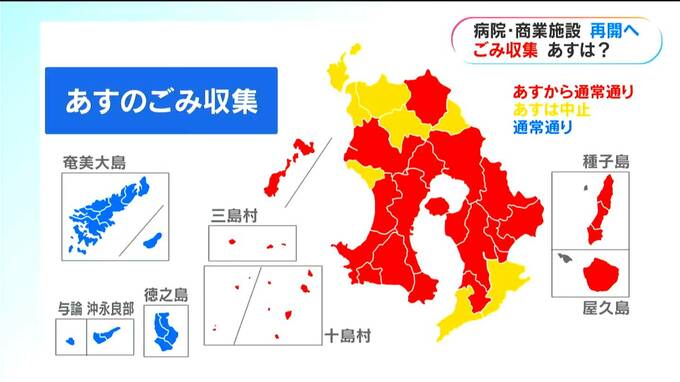 「30日から通常通り」に収集するのは赤色で示している鹿児島市、日置市、霧島市など15の市と6つの町、三島村と十島村です。