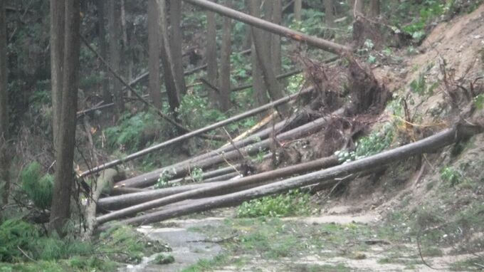 藤川天神の近くをさらに奥へ進んだあたりに複数か所、10本ほどの倒木が見られ、現在、18世帯23人が住む本俣地区へ向かう市道が通れない状況だということです。