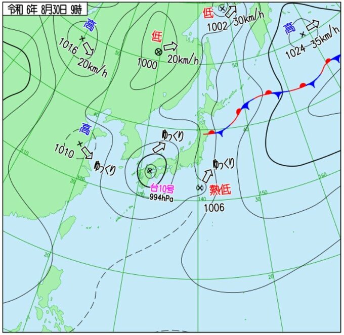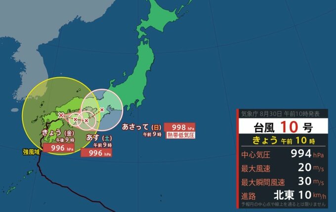 台風10号は30日午前、大分県の北東部を1時間におよそ10キロの速さで北東へ進んでいます。台風はこのあと勢力を弱めながら西日本を東へ進み、1日頃に熱帯低気圧に変わる見込みです。