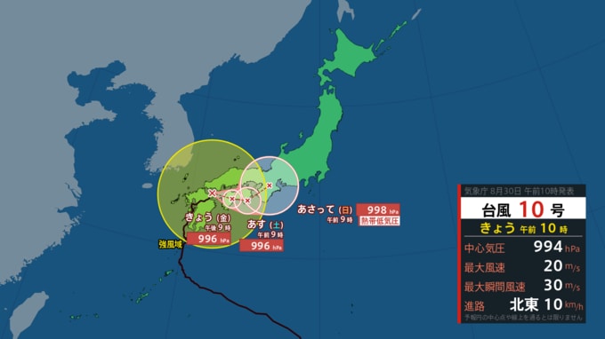 「台風10号」は、北緯33度50分、東経131度55分を中心に山口県『柳井市付近』で北東方向に時速15kmの速さで進むとみられています。中心の気圧は994ヘクトパスカルで中心付近の最大風速は20メートル、最大瞬間風速は30メートルとなっています。台風の全域390kmが秒速15m以上の強風域となっています。