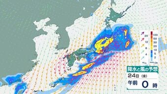 また、台風本体から離れた東日本でも、台風周辺や太平洋高気圧の縁を回る暖かく湿った空気が流れ込んでいるため、太平洋側の地域を中心に断続的に雷を伴った非常に激しい雨や激しい雨が降っている所があります。