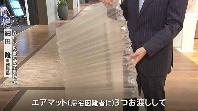 「エアマットを(帰宅困難者に)3つお渡しして床に置いていただいて、例えば日中でしたら座っていただく。夜間ですと、これを3枚敷き詰めてこちらで横になってお休みいただく」