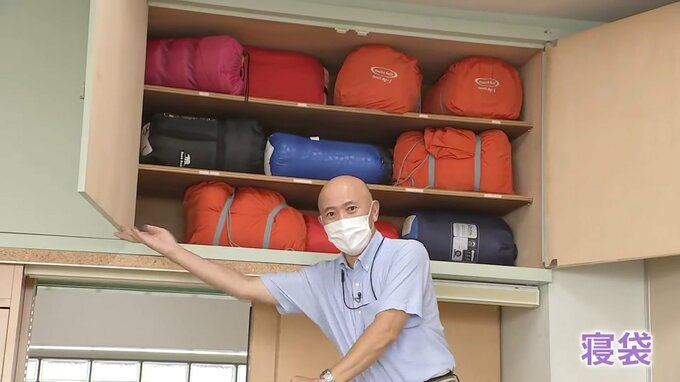 昭和小学校では、地震発生から1週間は児童が学校に寝泊まりできるように全児童分の食料や水、各家庭で購入した寝袋を用意しています。