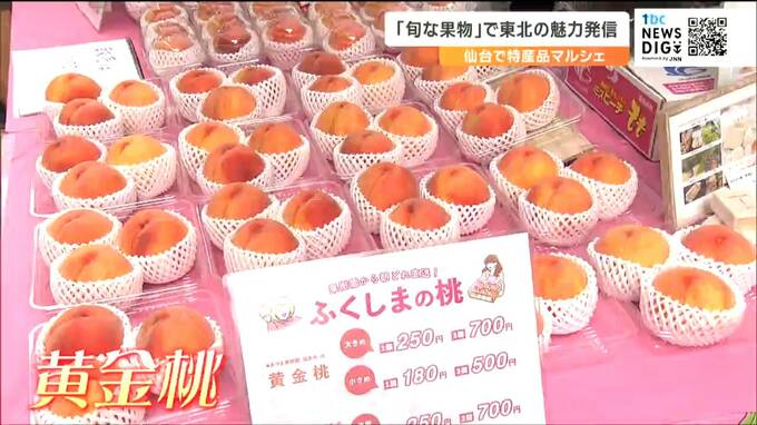 福島県からは30日朝、収穫されたばかりでマンゴーのような食感が特徴の黄金桃を買うことができるほか、伊達市で生産されているシャインマスカットは、市価よりも2割ほど安い値段で販売されています。