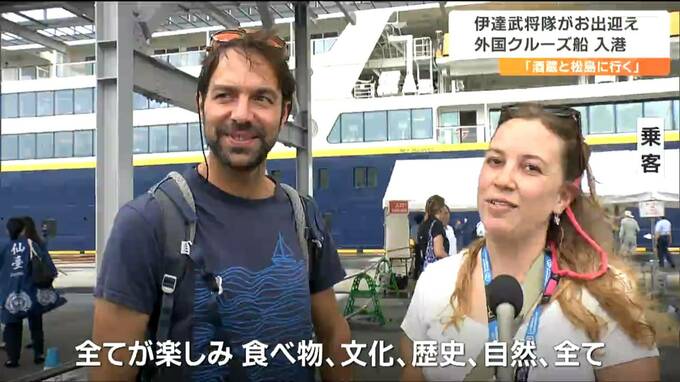 岸壁では、伊達武将隊が船を出迎え演舞を披露して盛り上げました。乗客はおよそ130人で、8月中旬にアメリカのアラスカを出港した後、太平洋を横断し網走港や青森港を経由して仙台港に入りました。