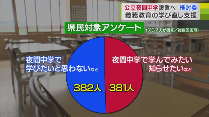 また、不登校の生徒は2022年度1638人という現状がある上、昨年度の県民アンケートでは夜間中学で学んでみたい、または夜間中学のことを知らせたいと思う人が周りにいると回答した人が全体の半数を占めました。