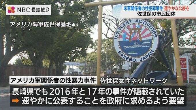 アメリカ軍関係者による性犯罪事件が警察から報告されていなかったとして、市民団体が事件後の速やかな公表を政府に求めるよう佐世保市に要望しました。要望したのは佐世保女性ネットワークのメンバーです。アメリ…