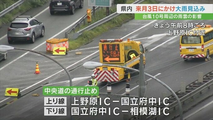 中央道は、雨のため上り線が上野原インターから国立府中インターまで下り線が国立府中インターから相模湖インターまで通行止めとなっています。