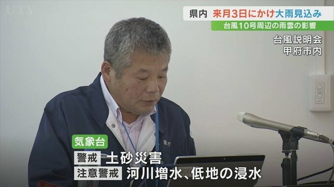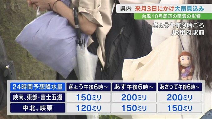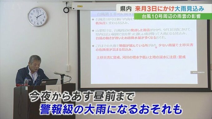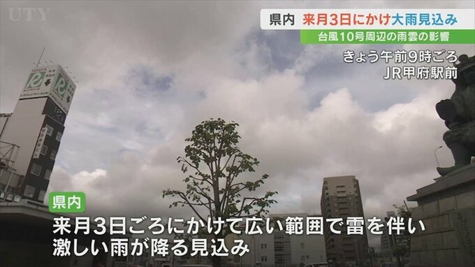 台風10号周辺の発達した雨雲の影響で、山梨県内はこの後から9月3日にかけて広い範囲で大雨となる見込みです。