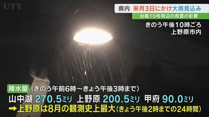 甲府地方気象台によりますと、29日午前6時の降り始めから30日午後3時までの降水量は山中湖で270.5mm、上野原で200.5mm、甲府で90.0mmなどとなっています。このうち上野原は30日午後2時までの24時間降水量が8月の観測史上最大となりました。