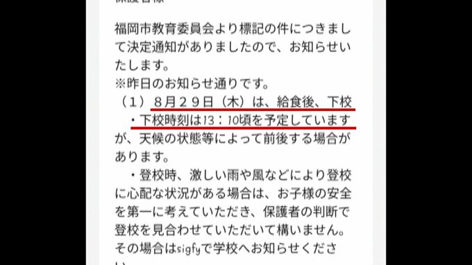 福岡市の小中学校では29日、暴風警報が発表されている最中に児童生徒が登校しました。福岡市教育委員会の判断に、保護者や教員から批判の声が上がり、市教委は29日夜、保護者に謝罪のメールを送りました。