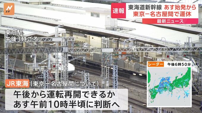 交通への影響について最新情報です。JR東海はさきほど、東海道新幹線について、あす始発から東京-名古屋間で運転を見合わせると発表しました。名古屋から東京に行く人「東京ドームにコンサートに行く予定でした。…