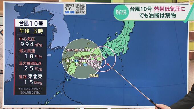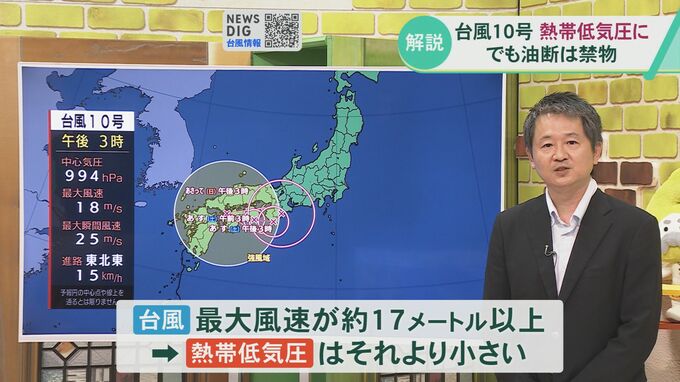 この時点では熱帯低気圧に変わる見込みで、台風からは勢力は弱まっています。台風は最大風速がおよそ17メートル以上、熱帯低気圧はそれよりも小さいのですが決して油断はしないでください。
