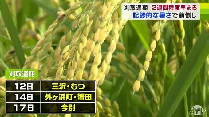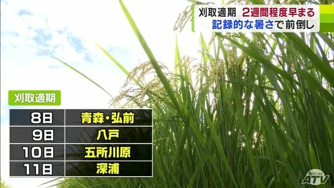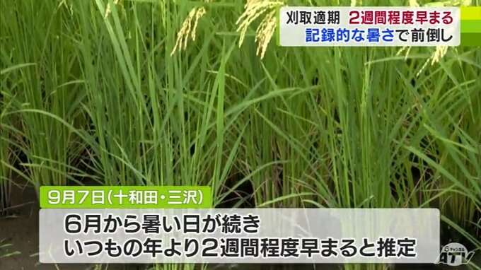 今週に入り天候は大きく崩れていますが、それまでは2024年は6月から記録的な暑さが続きました。この影響でイネの生育が進み、青森県は刈り取り適期がいつもの年より2週間程度早まると推定される地域もあると発表しました。