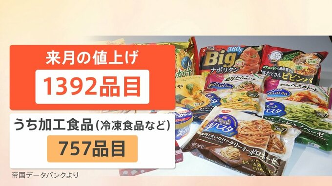 帝国データバンクによると、9月は1392品目で値上げが行われるということです。そのうち最も多いのが、冷凍食品などの加工食品で757品目にも上ります。