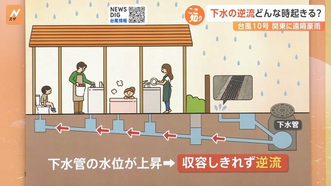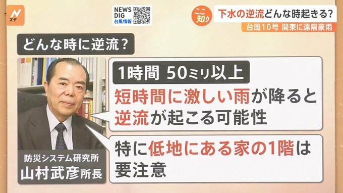 防災システム研究所の山村武彦所長は「1時間に50ミリ以上、短時間に激しい雨が降ると逆流が起こる可能性がある。特に低地にある家の1階は要注意」といいます。