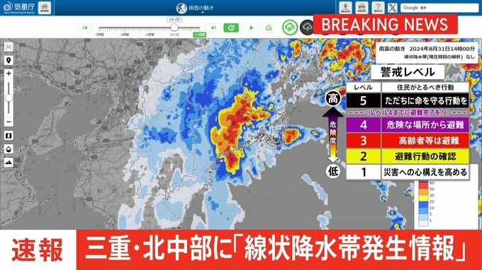 気象庁は午後1時57分、三重県北中部に「線状降水帯発生情報」を発表しました。この情報が発表された地域では、線状降水帯によって非常に激しい雨が降り続いていて、命に危険が及ぶ土砂災害や浸水、河川の洪水など…