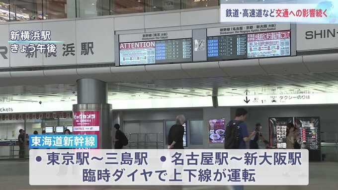 台風10号の、交通への影響です。きのう、一時、全線で運休していた東海道新幹線の▼名古屋と新大阪の間の上下線は始発から、▼東京と三島の間の上下線は正午ごろから、臨時のダイヤで運転を開始しました。全席自由…