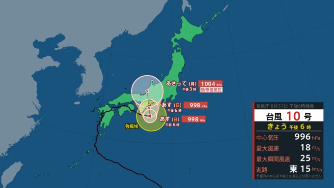 台風10号は、31日(土)午後6時現在、潮岬の東南東およそ100キロにあって、