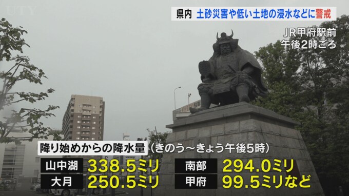 甲府地方気象台によりますと、30日の降り始めから31日午後5時までの降水量は、山中湖で338.5ミリ、南部で294.0ミリ、甲府で99.5ミリなどとなっています。