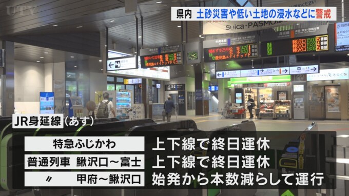 雨の影響で、JR身延線は1日、特急「ふじかわ」を上下線で終日運休とし、普通列車も鰍沢口と富士の間の上下線で終日運休、甲府から鰍沢口の間は、始発から本数を減らして運行するということです。
