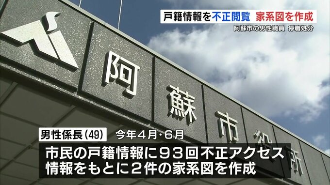 阿蘇市は市民の戸籍情報に不正にアクセスし、家系図を作成していたとして男性係長を停職3か月の懲戒処分にしました。停職3か月の懲戒処分となったのは、阿蘇市役所波野支所に勤務する49歳の男性係長です。阿蘇市に…