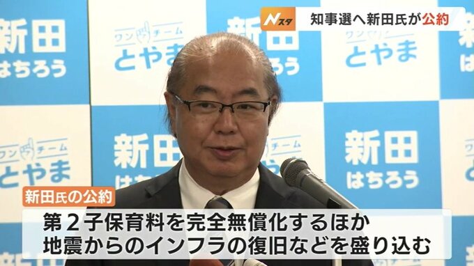 10月27日の富山県知事選挙に向け、再選を目指す現職の新田八朗氏が1日、選挙公約を発表しました。保育料の無償化の拡大など「未来に向けた人づくり」が柱です。