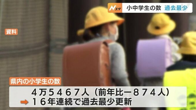 ことし5月1日時点の、県内の小学生の数は、4万5467人と、前年度より874人減り、16年連続で過去最少を更新しました。