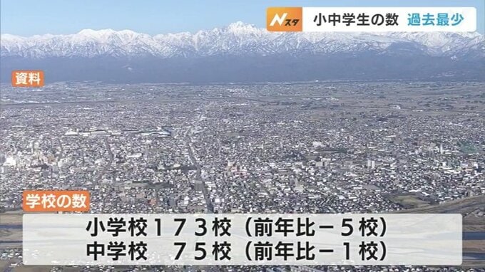 また、県内の小学校の数は173校で、前年度と比べると5校減少。中学校は75校で1校減少しました。