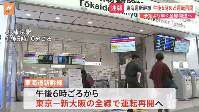JR東海は先ほど、一部区間で運転を取りやめていた東海道新幹線について、このあと午後6時ごろから、東京-新大阪間の全線で運転を再開すると発表しました。午後6時ごろから午後8時ごろまでに東京駅と新大阪駅を出発…