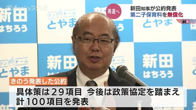 新田知事が発表した公約の具体策は29項目で、今後は支援を受ける政党や団体と結んだ政策協定を踏まえ、合わせて100項目を発表します。