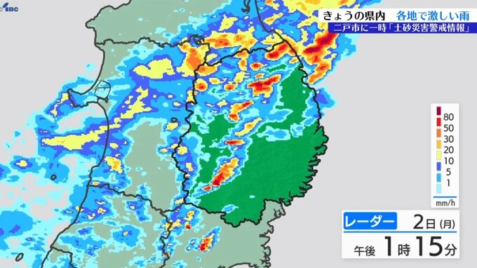 前線や湿った空気の影響で2日の岩手県内は各地で激しい雨が降り、二戸市には一時、土砂災害警戒情報が出されました。